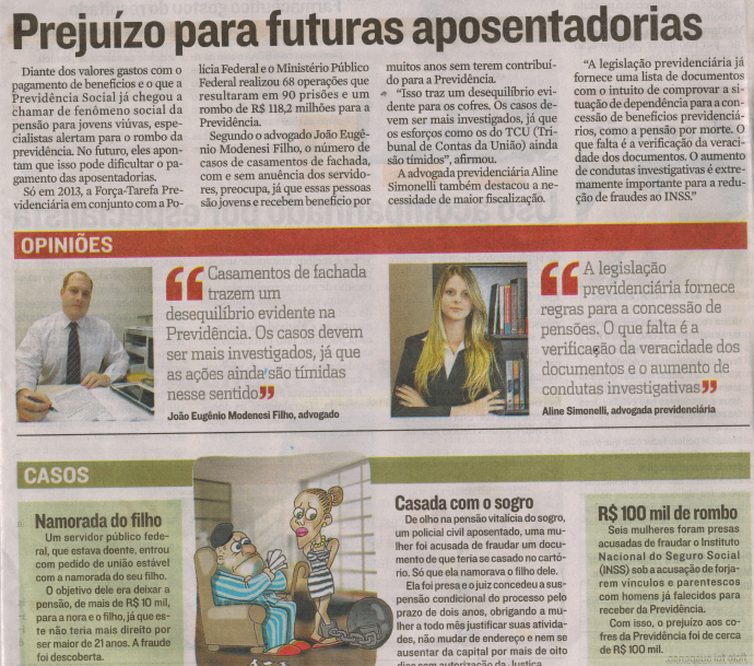 Em reportagem especial para o jornal “A Tribuna”, a advogada previdenciária Aline Simonelli Moreira, sócia do Brito & Simonelli Advocacia e Consultoria, comenta sobre fraudes realizadas por segurados para o recebimento de pensões ilegais no INSS.